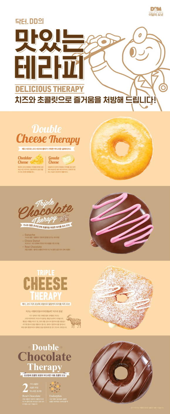 ‘닥터 DD의 맛있는 테라피’ 도넛 4종은 부드러운 치즈와 달콤한 초콜릿으로 맛있는 즐거움을 선사한다는 콘셉트의 제품이다.