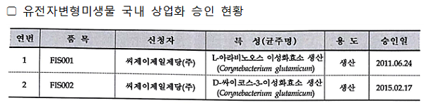또 상업화 승인된 국산 GM미생물 FIS001과 FIS002로 만든 설탕대체 감미료는 씨제이제일제당의 스위트리 타가토스와 알룰로스 2가지 제품다. 이들 GM미생물을 이용한 식품첨가물은 주료 단 맛을 내는 당류인 것으로 알려졌다.