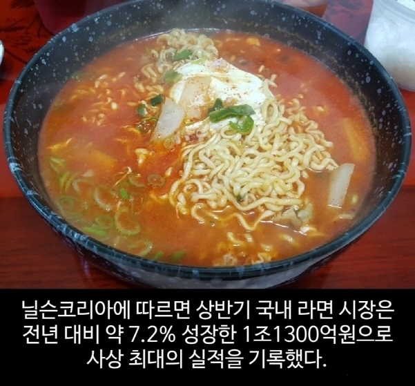 [푸드투데이 = 조성윤기자] 신종 코로나바이러스 감염증(코로나19) 확산으로 올해 상반기 라면 시장이 꿈틀거리고 있다. 닐슨코리아에 따르면 상반기 국내 라면 시장은 전년 대비 약 7.2% 성장한 1조1300억원으로 사상 최대의 실적을 기록했다.