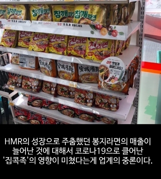 가정간편식(HMR)의 성장으로 주춤했던 봉지라면의 매출이 늘어난 것에 대해서 코로나19으로 클어난 '집콕족'의 영향이 미쳤다는게 업계의 중론이다.