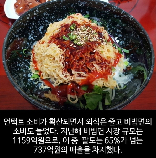 언택트 소비가 확산되면서 외식은 줄고 비빔면의 소비도 늘었다. 식품산업통계정보에 따르면 지난해 비빔면 시장 규모는 1159억원으로, 이 중 65%가 넘는 737억원의 매출은 팔도가 유일하다. 팔도비빔면은 지난해까지 약 14억 개가 판매되며 6100억 원 이상의 매출을 올렸다. 비빔면 시장 점유율은 약 64%에 달한다.