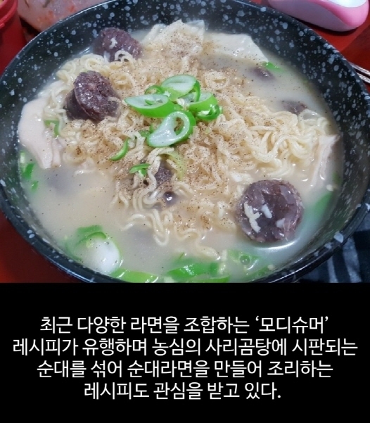최근 다양한 라면을 조합하는 ‘모디슈머’ 레시피가 유행하며 농심의 사리곰탕에 시판되는 순대를 섞어 순대라면을 만들거나 오뚜기의 진짬뽕과 진짜장을 함께 조리하는 레시피도 관심을 받고 있다.