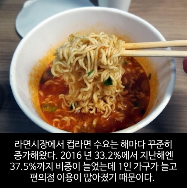 라면시장에서 컵라면 수요는 해마다 꾸준히 증가해왔다. 2016 년 33.2%에서 지난해엔 37.5%까지 비중이 늘었는데 1인 가구가 늘고 편의점 이용이 많아졌기 때문이다.