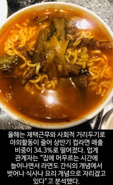 올해는 재택근무와 개학연기 등 사회적 거리두기로 야외활동이 줄어 상반기 컵라면 매출 비중이 34.3%로 떨어졌다. 농심 관계자는 “집에 머무르는 시간에 늘어나면서 ‘집쿡(집에서 요리)’이 일상화 됐고, 라면도 간식의 개념에서 벗어나 식사나 요리 개념으로 자리잡고 있다”고 분석했다.