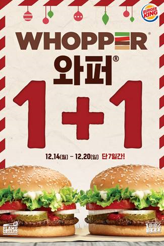 [푸드투데이 = 조성윤기자] 버거킹이 20일까지 ‘와퍼’와 ‘불고기와퍼’ 주문 시 버거를 하나 더 제공하는 ‘1+1 프로모션’을 실시한다.