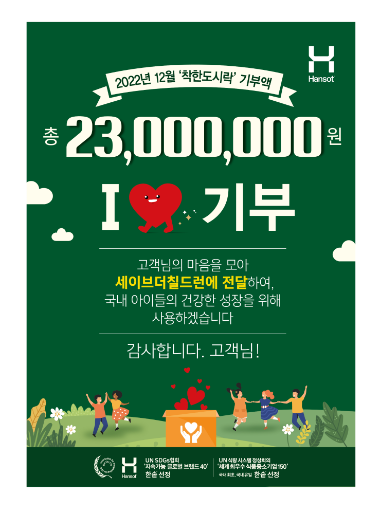 한솥 ‘착한도시락’ 기부는 지난 2018년부터 매해 실시되고 있으며 현재 누적 총 금액은 1억 2천만원을 넘어섰다. 2018년 21,861,700원, 2019년 22,618,162원, 2020년 20,000,000원, 2022년 33,500,000원, 2023년 2500만원을 ‘세이브더칠드런’에 기부해 오고 있다.