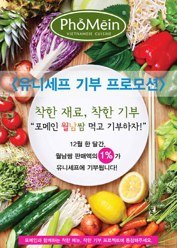 베트남 쌀국수 전문점 포메인(대표 김대일)이 12월 한 달간 월남쌈 판매액의 1%를 유니세프에 기부하는 ‘착한 재료, 착한 기부’ 프로모션을 진행한다.