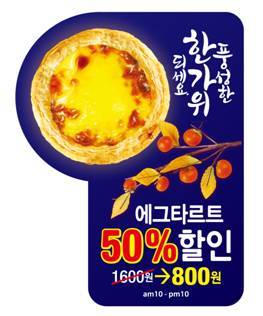 추석 연휴를 전후로 ‘에그타르트’ 단품을 절반 가격인 800원에 제공하며, 가볍게 간식이나 디저트로 즐기기 좋다.