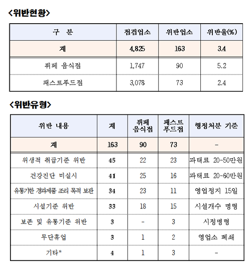 식품의약품안전처(처장 손문기)는 봄철을 맞이해 결혼식, 봄나들이 등으로 이용객 증가가 예상되는 뷔페 음식점과 패스트푸드점의 식품안전을 확보하기 위해 지난 4월 18일부터 29일까지 4825곳을 점검하고 163곳을 적발해 행정처분 등 조치했다고 17일 밝혔다.