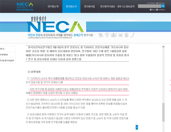 그러자 일부 언론에서는 이러한 발표 내용을 바탕으로 한국보건의료연구원이 “식약처가 나서서 즉각 제품 판매를 중단하고 안전성 재조사에 나서야 한다”는 내용으로 보도했다.