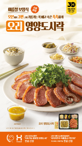 한편 오리고기는 불포화지방산과 단백질이 풍부해 여름철 보양식으로 인기가 높은 식재료다. 원기회복과 면역력 강화는 물론 해독작용, 노화방지, 피부미용 등에도 탁월한 효과가 있는 것으로 알려져 있다. 한솥의 '오리 영양도시락'은 무항생제 오리를 사용하고 보존료(소브산칼륨)나 산화방지제(에리토브산나트륨)를 사용하지 않아 더욱 건강하고 맛있게 즐길 수 있는 건강 메뉴다.