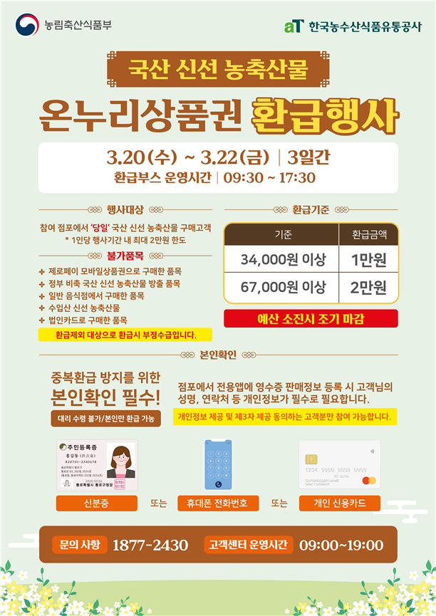 이번 행사는 전통시장에서 국산 농축산물을 구매한 소비자들에게 구매 금액의 최대 30%를 1인당 최대 2만원 한도로 온누리상품권으로 환급해 주는 행사이다. 소비자들은 행사 추진 시장에서 국산 신선 농축산물을 구매하고 영수증과 신분증을 지참하여 시장 내 환급 부스에 가면 본인 확인 후 온누리상품권을 환급받을 수 있으며, 행사 참여 시장 등 자세한 내용은 공식 누리집(sale.foodnuri.go.kr)에서 확인할 수 있다.