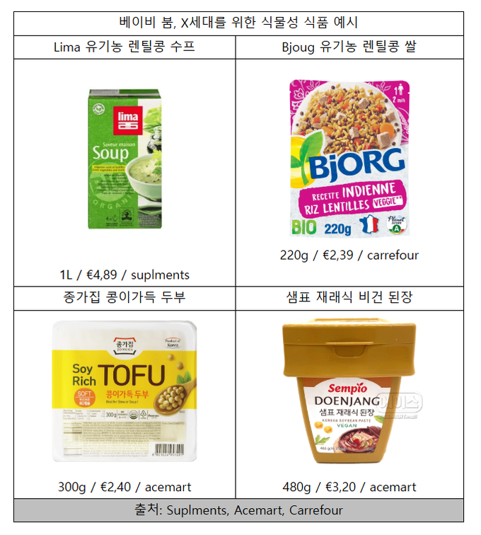 유기농 렌틸콩 수프, 곡물과 콩을 조합한 식단, 두부를 활용한 간편 조리형 제품 등이 이들에게 적합한 제품군으로 평가된다. 한국 식품으로는 된장국과 같이 두부가 포함된 가정식 스타일 제품이 유효할 수 있다.