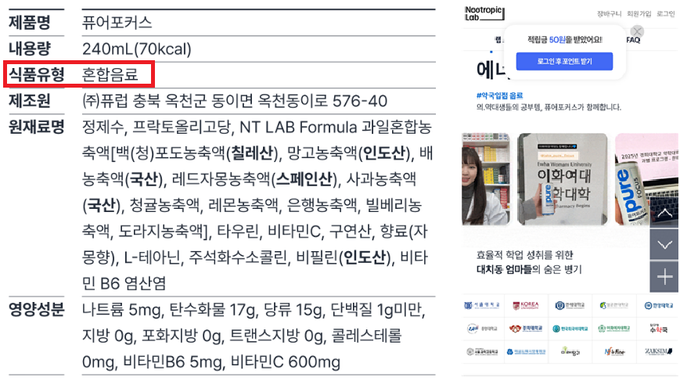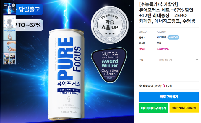 ‘퓨어포커스 서울대음료’ 역시 이름에 ‘서울대’를 붙이고 “약국입점 음료”, “의·약대생 공부템”, “ZERO 카페인 집중력 드링크” 등 문구를 내세운다. 광고 이미지에는 교재·노트북·시험 대비 장면이 삽입돼 “의대생이 마시는 공부용 음료”라는 심리적 착시 효과를 유발한다는 비판이다.