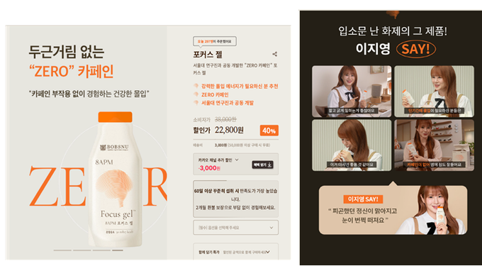 문제가 된 제품은 밥스누가 판매하는 ‘포커스 젤(Focus Gel)’과 ‘스마트드링크 퓨어포커스 서울대음료’다. 광고에는 ‘서울대 연구진 공동개발’, ‘아이비리그 협력’, ‘공부 루틴 젤리’, ‘몰입 에너지 4배’ 등의 자극적 문구가 반복되고, 입시 강사 이지영 씨가 직접 출연해 “공부할 때 필요한 젤리”로 홍보했다.