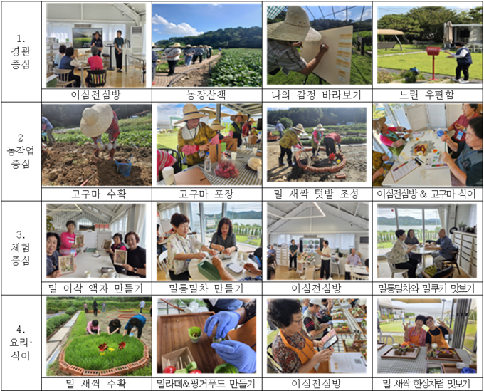 치유 프로그램은 주 1회 총 4회에 걸쳐 농촌 문화, 원예, 치유 음식 자원을 접목해 경관, 체험, 요리·식이, 농작업 4가지 유형 활동으로 1회차 경관은 수수․옥수수․콩 등 식량작물 재배지에서 명상하기, 2회차 농작업으로 고구마 수확 및 밀 새싹 텃밭 조성, 3회차 체험에는 나를 위한 밀 새싹 액자와 티백 만들기, 4회차 요리·식이는 밀 새싹 맨손음식(핑거푸드)과 밀 새싹 라떼 만들기 등으로 구성했으며, 모든 회차마다 참여자가 서로 소통하고 활력을 증진할 수 있도록 친교 시간을 마련했다고 농진청은 설명했다.