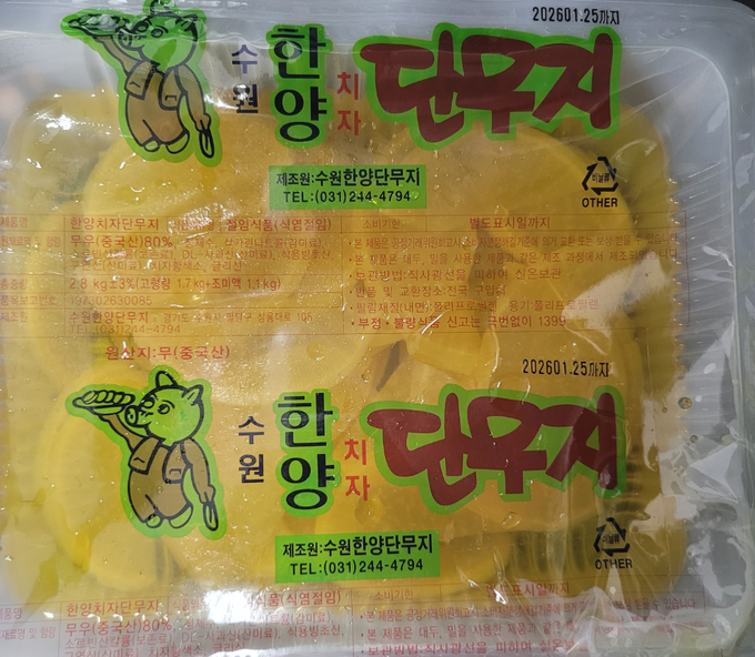 [푸드투데이 = 황인선기자] 식품의약품안전처(처장 오유경)는 식품제조가공업소인 '한양단무지’(경기도 수원시)'에서 제조한 '수원한양치자단무지(식품유형: 절임식품)'제품이 '식품첨가물(타르색소) 기준 규격 부적합'으로 확인돼 판매 중단 및 회수조치 중이라고 11일 밝혔다.