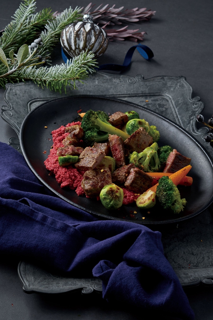 데친 채소는 팬에 구워 풍미를 더하고, 밑간한 한우 등심도 취향에 맞게 구워 한입 크기로 자르고 접시에 비트 후무스를 펼친 뒤 구운 한우 등심과 채소를 올리고 크러쉬드 페퍼·검은깨로 마무리하면 된다.