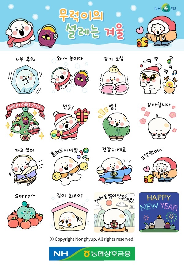 여영현 대표이사는 “한 해 동안 농협상호금융과 무럭무럭 친구들을 사랑해주신 고객 여러분께 감사드리며, 이번 이모티콘이 연말연시 따뜻한 마음을 전하는 데 보탬이 되길 바란다”며, “앞으로도 고객에게 친근하게 다가갈 수 있는 다양한 콘텐츠와 혜택을 지속적으로 제공하겠다”고 밝혔다.