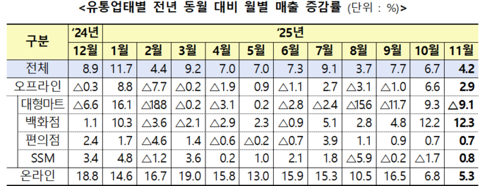 [푸드투데이 = 노태영기자] 산업통상부(장관 김정관, 이하 산업부)는 지난 11월 주요 유통업체 오프라인 13곳, 온라인 10곳의 매출 동향을 분석한 결과, 전체 매출이 전년 동월 대비 4.2% 증가했다고 23일 밝혔다.