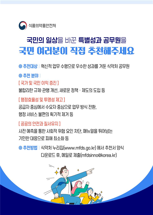[푸드투데이 = 황인선기자] 식품의약품안전처(처장 오유경)는 국민이 체감하는 탁월한 성과를 창출한 공무원을 국민이 직접 추천해 포상하는 ‘국민추천제’를 20일부터 운영한다고 밝혔다.