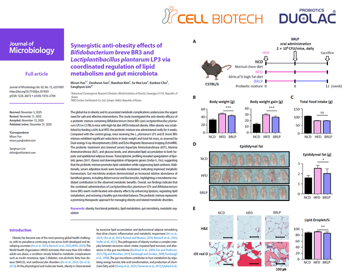 이어 “이번 연구는 듀오락 CBT 유산균이 장내 미생물 환경 개선을 기반으로 체지방 감소와 대사 기능 개선에 기여할 수 있음을 과학적으로 입증한 사례”라며 “약물 중심 치료의 한계를 보완할 수 있는 안전하고 지속 가능한 비만 관리 전략으로서 마이크로바이옴 기반 솔루션의 가능성을 제시했다는 점에서 의미가 크다”고 덧붙였다.