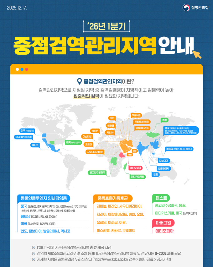 질병청은 동물인플루엔자인체감염증, 중동호흡기증후군 등이 발생하여 집중적인 검역이 필요한 국가를 중점검역관리지역으로 지정하고 있으며, 2026년 1분기 기준으로 총 24개국을 대상으로 시행 중으로 해당 국가에서 입국하는 승객에 대해서는 Q-CODE, 건강상태질문서 제출 등 보다 강화된 검역 조사를 실시하고 있다고 설명하며, 오는 10일부터 전국 공항, 항만에서 시행되는 호흡기 감염병 검사 사업이 현장에서 원활하게 운영될 수 있도록 준비하고 있다고 덧붙였다.