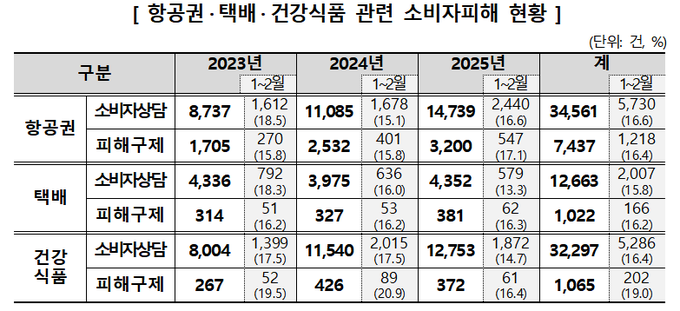 3일 소비자원과 공정위에 따르면 최근 3년간(2023~2025년) 설 연휴가 포함된 1~2월에 접수된 피해구제 사건은 항공권 1,218건, 택배 166건, 건강식품 202건으로 집계됐다. 이는 연간 피해구제 사건의 16~19% 수준으로 특정 시기에 피해가 집중되는 양상이다.
