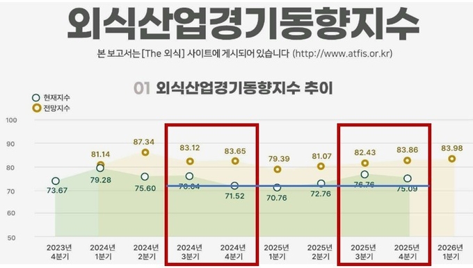 한국농수산식품유통공사(aT)에 따르면 2025년 4분기 외식산업경기동향지수는 75.09로, 전년같은 기간 71.52보다 높습니다. 외식업에 종사하는 사업자들이 체감하는 경기는 여전히 어렵지만, 2024년보다 2025년이 다소 호전됐음을 보여줍니다.