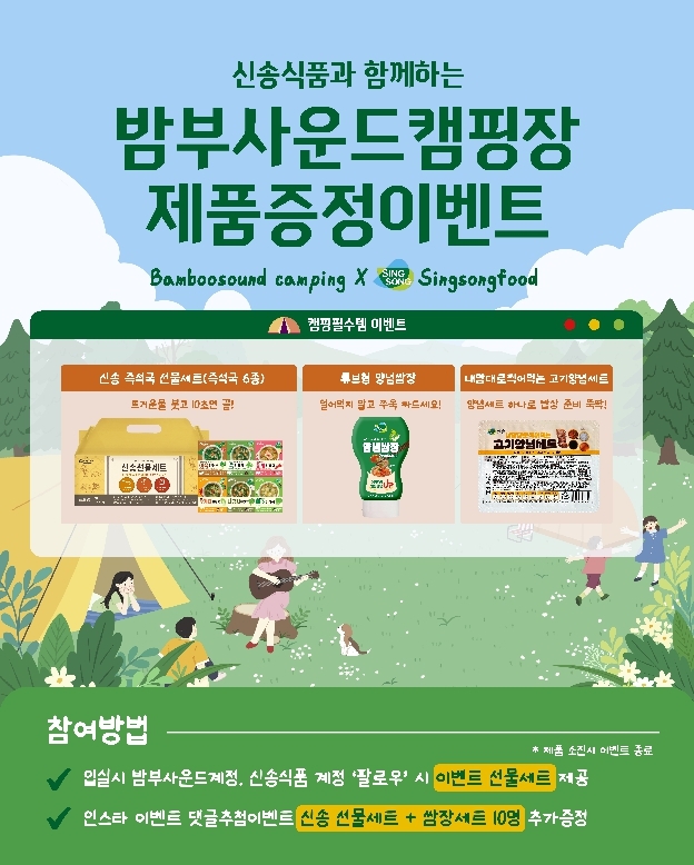 행사 참여 방법도 간단하다. 캠핑장 방문 시 밤부사운드캠핑장 공식 계정과 신송식품 계정을 팔로우하면 신송식품의 캠핑 맞춤형 선물세트 등 푸짐한 선물이 제공되며, SNS를 통한 댓글 이벤트도 추가로 진행된다. 댓글 이벤트에서는 추첨을 통해 신송 선물세트와 쌈장 세트를 추가 증정할 예정이다.