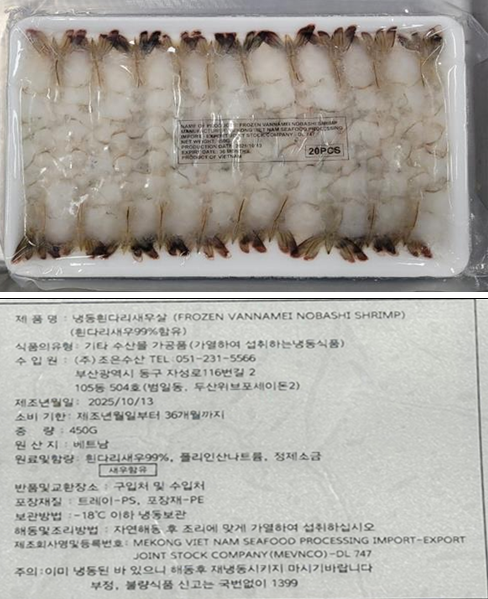 회수 대상 제품은 베트남 MEKONG VIET NAM SEAFOOD PROCESSING IMPORT-EXPORT JOINT STOCK COMPANY(MEVNCO)에서 제조된 제품으로, 총 수입량은 7,209kg(450g 단위)이다. 제조일자는 2025년 10월 13일, 소비기한은 2028년 10월 12일까지다.