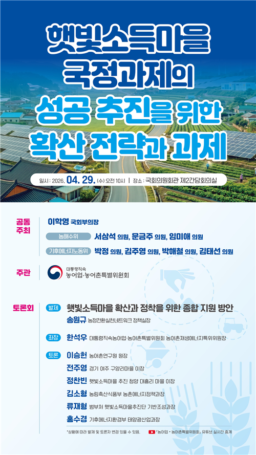 [푸드투데이 = 황인선기자] 정부가 추진 중인 ‘햇빛소득마을’ 정책의 확산 전략과 제도적 과제를 점검하는 국회 토론회가 열린다. 재생에너지 확대와 농어촌 소득 창출을 동시에 겨냥한 국정과제인 만큼 정책의 실효성과 현장 안착 여부를 둘러싼 논의가 본격화될 전망이다.