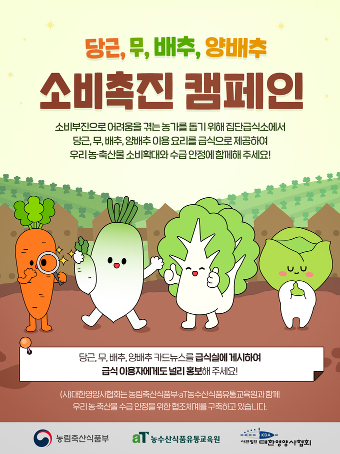[푸드투데이 = 황인선기자] 대한영양사협회(회장 송진선, 이하 협회)는 농림축산식품부, aT농수산식품유통교육원과 함께 내달 중 전국 집단급식소를 대상으로 ‘당근, 무, 배추, 양배추 소비촉진 캠페인’을 추진한다고 29일 밝혔다.