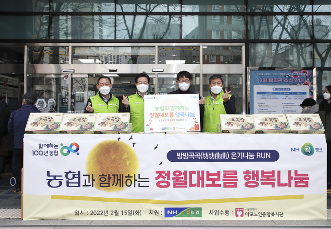 [푸드투데이 = 황인선기자] 농협(회장 이성희) 상호금융은 15일 정월대보름을 맞이해 서울시립마포노인종합복지관(관장 김윤태)을 찾아 오곡밥과 부럼세트 300상자를 전달하고, 이재식 상호금융대표이사 등 임직원들이 저소득층 어르신들께 직접 대보름 음식을 나눠 드리며 새해인사를 전하는 뜻깊은 시간을 가졌다.