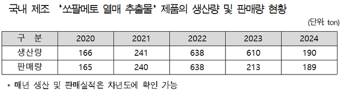 쏘팔메토의 판매량은 2020년 165톤에서 2022년 638톤으로 급증했으나, 2023년에는 생산량이 610톤에 달했음에도 판매량이 213톤으로 급감했다. 지난해에는 189톤 판매에 그친 것으로 나타났다.