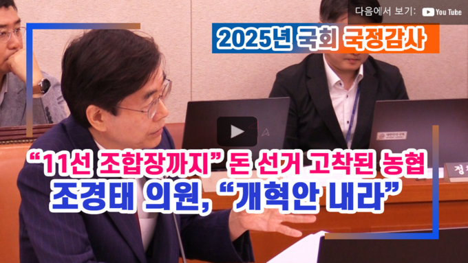 조 의원은 “금품선거는 일벌백계해야 하며, 재출마를 금지하는 제도적 장치가 필요하다”며 “이번 종합감사 전까지 농협이 강력한 개혁안을 제출하라”고 촉구했다.