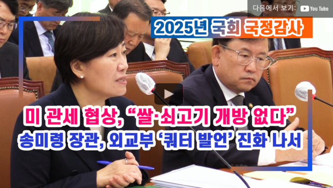 국민의힘 강명구 의원은 “외교부 장관이 ‘국별 쿼터를 늘릴 수 있다’고 말했는데, 농식품부 입장과 완전히 다르다”며 “농민들이 깜짝 놀랐다. 외교부 장관에게 직접 확인도 안 했다는 게 말이 되느냐”고 질타했다. 이에 송 장관은 “협상 주체는 외교부가 아니라 부총리·산업부·통상교섭본부장으로 구성된 협상팀”이라며 “쌀이나 쇠고기, 콩 등은 협상 의제로 검토된 적이 전혀 없다”고 답했다.