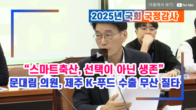 [푸드투데이 = 황인선.노태영기자] 28일 서울 여의도 국회에서 열린 농림축산식품해양수산위원회(위원장 어기구)의 농림축산식품부 등 종합감사에서 더불어민주당 문대림 의원(제주시갑)이 “축산 악취 해결과 K-푸드 수출 경쟁력 강화를 위해 정부가 스마트축산 시스템을 국가사업으로 전환해야 한다”고 강하게 질타했다.