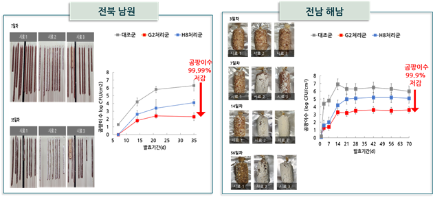 특히 연구진이 전북 남원과 전남 해남의 발효소시지 제조 현장에서 유산균 배양액을 제품 표면에 제조 직후, 건조·발효 3일 후 분무를 두 차례 한 결과, 곰팡이와 세균 증식이 크게 억제됐고, 남원에서는 건조·발효 5주 후 곰팡이 수가 99.99% 감소했고, 해남에서는 숙성 10주 후 99.9%가 감소하는 등 제품 폐기 위험을 낮출 수 있는 항균 효과가 확인됐다.