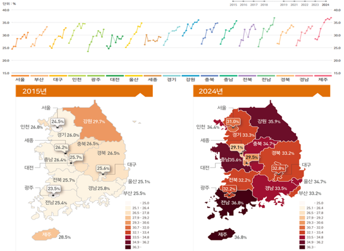 전남도는 11.4%p 상승하며 가장 큰 증가폭을 보였으며, 울산시와 충남도가 그 뒤를 이은 반면 세종시는 2.9%p 증가에 그쳐 가장 완만한 상승세를 보였으며, 대전시와 강원도도 상대적으로 낮은 상승폭을 기록했다.