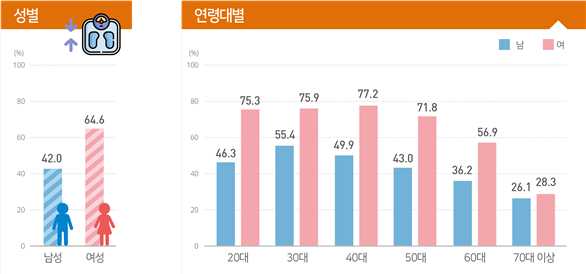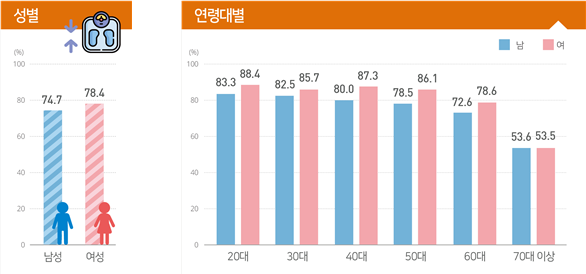 특히 전체 성인 인구 중 약 5명 중 3명인 65%가 체중을 줄이거나 유지하려고 했으며, 체중조절 시도율을 분석한 결과, 비만인 사람은 남성 74.7%, 여성 78.4%로 비만이 아닌 사람들은 남성 42.0%, 여성 64.6%로 비만이 아닌 집단에서도 체중조절 시도율이 높게 나타났으며, 여성이 남성보다 약 1.5배 높게 나타났고, 두 집단 모두 고령층으로 갈수록 체중조절 시도율이 낮아지는 경향이 있었다.