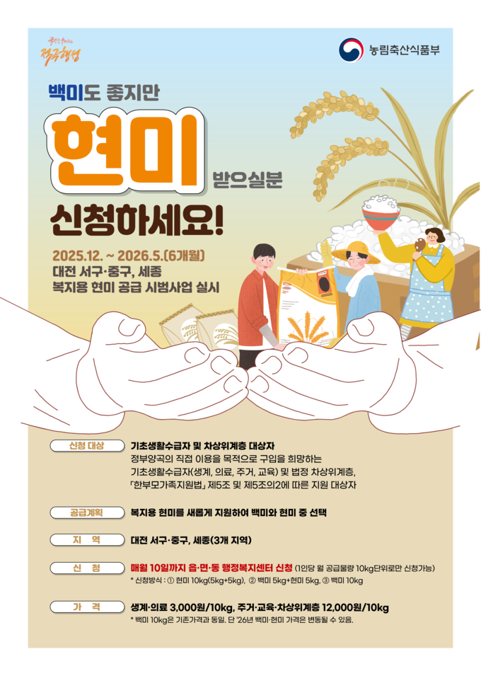[푸드투데이 = 노태영기자] 농림축산식품부(장관 송미령, 이하 농식품부)는 수요자 중심 행정서비스 제공, 취약계층의 건강 증진과 먹거리 복지 강화 등을 위해 12월부터 2026년 5월까지 복지용 현미 공급 시범사업을 대전 서구, 중구, 세종시 3개 지역에서 시행한다고 25일 밝혔다.