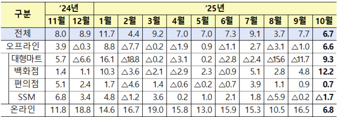 [푸드투데이 = 노태영기자] 산업통상부(장관 김정관, 이하 산업부)는 지난 10월 주요 유통업체의 오프라인 13개사 매출은 6.6% 증가했고, 온라인 10개사 매출도 6.8% 증가해 전체 매출은 전년 동월 대비 6.7% 증가했다고 26일 밝혔다.
