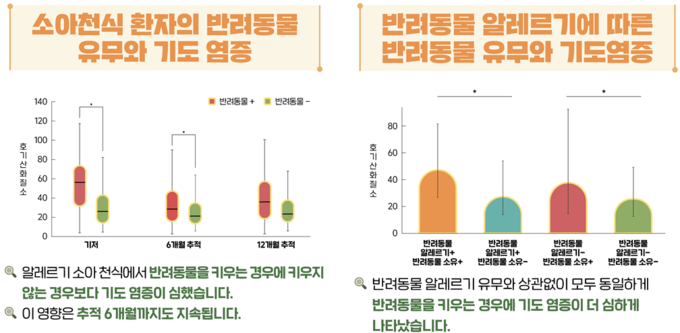 반려동물 알레르기 유무와 상관없이 반려동물을 키우는 경우에 기도 염증이 더 심하게 나타났고, 알레르기 소아천식 환자 중에서 반려동물을 키우는 경우 키우지 않는 경우보다 천식이 더 심했을 뿐 아니라, 반려동물 알레르기 유무와 상관없이 반려동물을 키우는 경우 천식이 더 심해지는 경향을 보였으며, 반려동물 알레르기 검사에서 음성이라 하더라도, 실제 생활환경에서의 반려동물 노출 자체가 알레르기 소아천식 환자의 기도 염증을 증가시켜 질병의 관리가 어려울 수 있음을 시사한다고 연구팀은 설명했다.