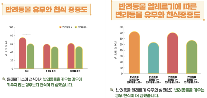 그 결과, 알레르기 소아천식 환자 중에서 반려동물을 키우는 경우 키우지 않는 경우보다 기도 염증이 심했고, 이 영향은 추적 6개월까지도 지속했고, 최근 12개월 동안의 입원 경험이 더 잦았으며, 폐기능은 낮은 양상을 보였다.