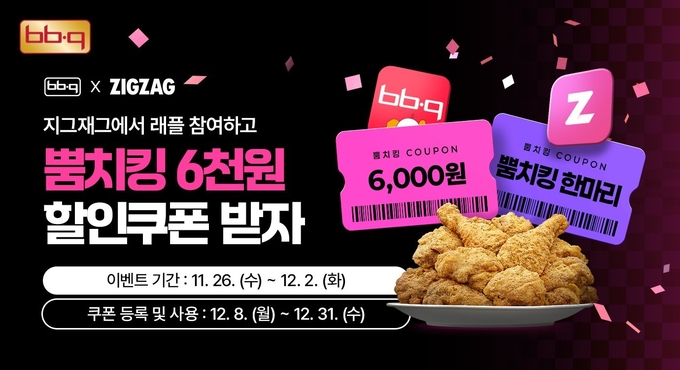 이번 프로모션은 지그재그 앱 내 BBQ 래플 페이지에서 12월 2일까지 응모 가능하며, 결과는 3일 발표되고, 추첨을 통해 50명에게 뿜치킹 한 마리 쿠폰을 제공하고, 응모한 모든 고객에게 6,000원 할인 쿠폰이 지급된다. 당첨 쿠폰은 BBQ앱에 등록해 올해 말까지 사용할 수 있다.