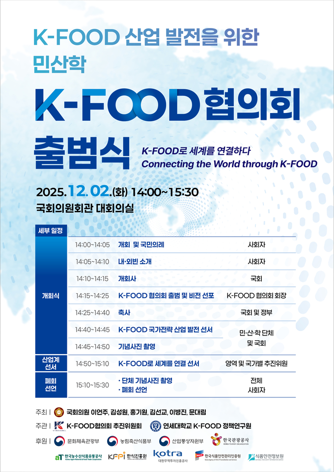 이번 협의회 출범식은 농림축산식품부, 산업통상자원부, 문화체육관광부, 한국관광공사, KOTRA, 한국농수산식품유통공사(aT), 식품안전정보원, 한국식품안전관리인증원(HACCP인증원), 한식진흥원 등이 후원한다. K-FOOD의 글로벌 위상이 높아지는 가운데 산업계–학계–정부를 잇는 민간 주도의 통합 협의체가 필요하다는 데 뜻을 모았다.