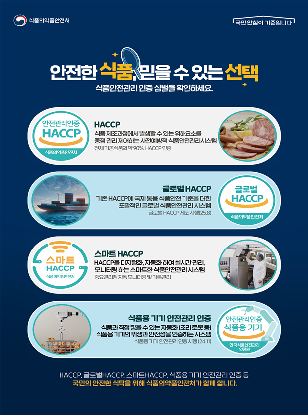‘해썹(HACCP) 제도’는 1995년 도입된 이후 식품 안전에 대한 국민 의식 수준이 높아지고 산업 환경이 급변함에 따라 ‘스마트 해썹’, ‘글로벌 해썹’, ‘식품용 기기 안전관리 인증’ 등으로 확대·고도화돼 왔으며, 우리 식품 안전 관리 체계의 글로벌 경쟁력 강화에 기여하는 대표적인 정책으로 자리매김했다.