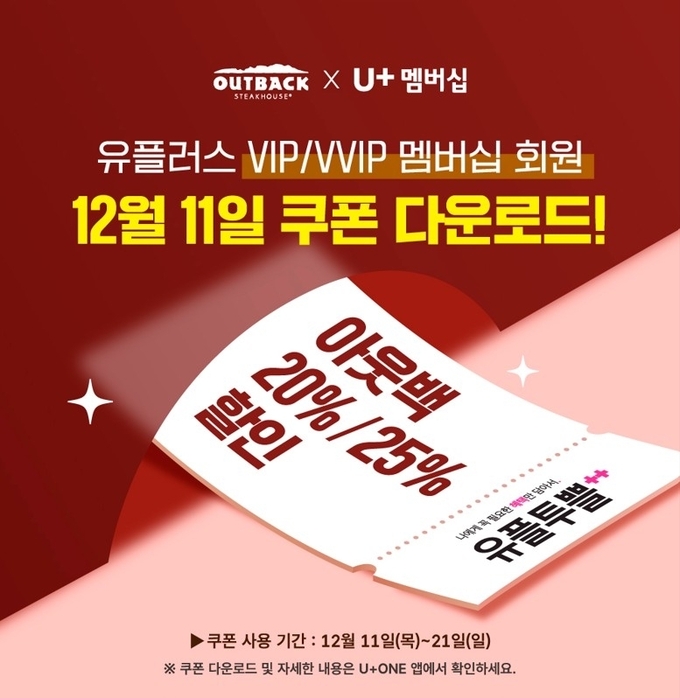 이번 행사는 각종 모임이 잦은 12월, 아웃백을 찾는 고객들이 더욱 가볍고 즐거운 마음으로 식사를 즐길 수 있도록 기획되었다. LG유플러스 멤버십 VVIP 및 VIP 등급 고객이라면 누구나 참여 가능하며, 등급에 따라 결제 금액의 20% 또는 25% 할인 혜택을 받을 수 있다.
