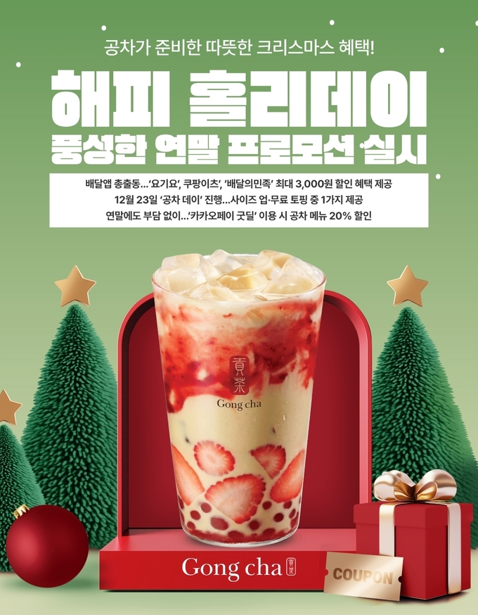 공차는 자사 단독 행사인 공차 데이부터 요기요, 쿠팡이츠, 배달의민족 등 주요 배달앱과 카카오페이 등 제휴 채널을 포함하는 '해피 홀리데이’ 시즌 혜택을 순차적으로 선보인다고 15일 밝혔다.